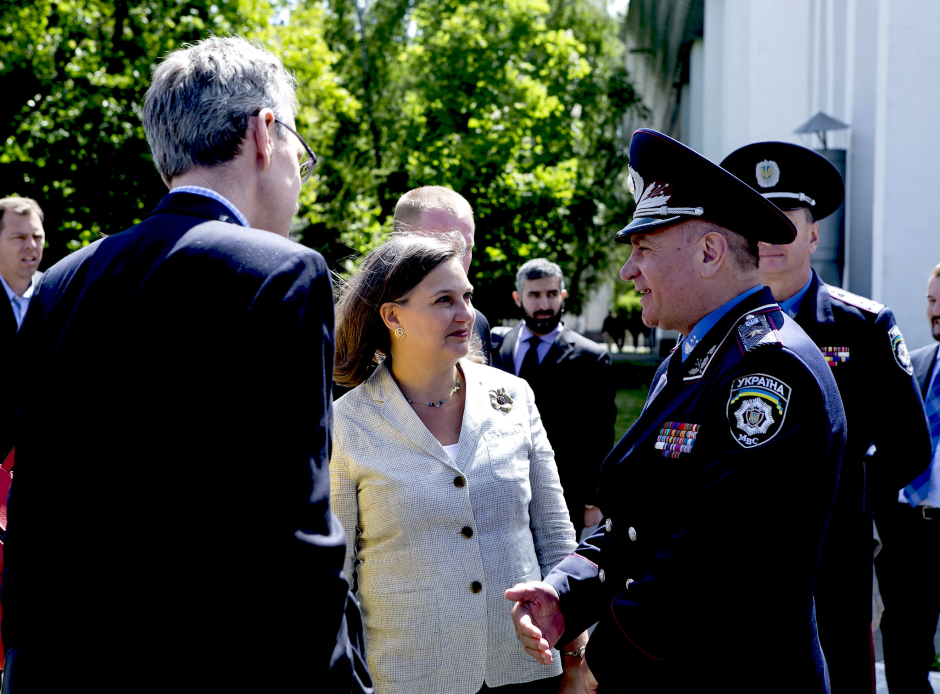 Victoria Nuland, éminente néoconservatrice qui occupait lors du coup d'Etat en 2014 le poste de secrétaire d'État adjointe par intérim des États-Unis. Elle était ici sur le site d'entraînement des patrouilles de police à Kiev le 16 mai 2015 (Ambassade des États-Unis à Kiev, Flickr)
