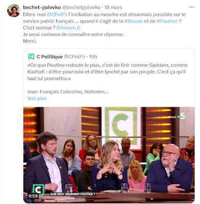 Et l'hystérie se porte à merveille sur le service public français de l'audio-visuel, sans aucune réaction des autorités de surveillance, qui préféraient se battre contre RT ou Sputnik, afin de détruire tout discours alternatif, et qui préfèrent aujourd'hui s'attaquer à CNews, pourtant bien aligné, que de sanctionner les appels au meurtre. Sur le fond, l'on appréciera la réécriture de l'histoire : Saddam et Kadhafi n'ont pas du tout, mais absolument pas, été écartés et liquidés par les Atlantistes, mais non, c'est uniquement le résultat naturel de la volonté populaire. Amen !