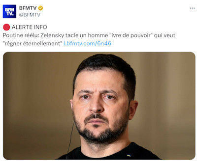 Les médias préfèrent donner la parole à Zelensky, qui s'inquiète de la durée du mandat de Poutine sans lui demander de justifier l'annulation de toutes les élections nationales en Ukraine. Aurait-il peur d'être trop largement rejeté par la population, pour que la manipulation des élections sous l'égide des organismes internationaux ne permette pas de compenser ce désaveu populaire massif ? Remarquez, de ce point de vue, Zelensky est un véritable président atlantiste – il gouverne contre l'intérêt de son pays et malgré la volonté de son peuple.