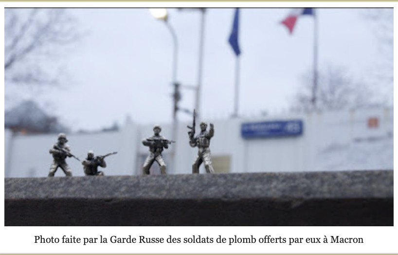 Cette propagande primaire est déversée sur toutes les ondes. Comment prendre au sérieux une telle faiblesse politique ? Ce n'est plus possible. Et la Russie l'a fait savoir : la Garde nationale russe a déposé à l'Ambassade de France en Russie un petit cadeau pour Macron : des soldats de plomb et un petit camion, avec une lettre explicative.