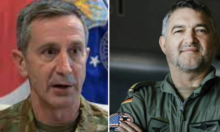À esquerda, o general Kevin Schneider; à direita, o general de brigada Frank Graefe, usando um adesivo de um exercício aéreo conjunto entre os EUA e a Alemanha.