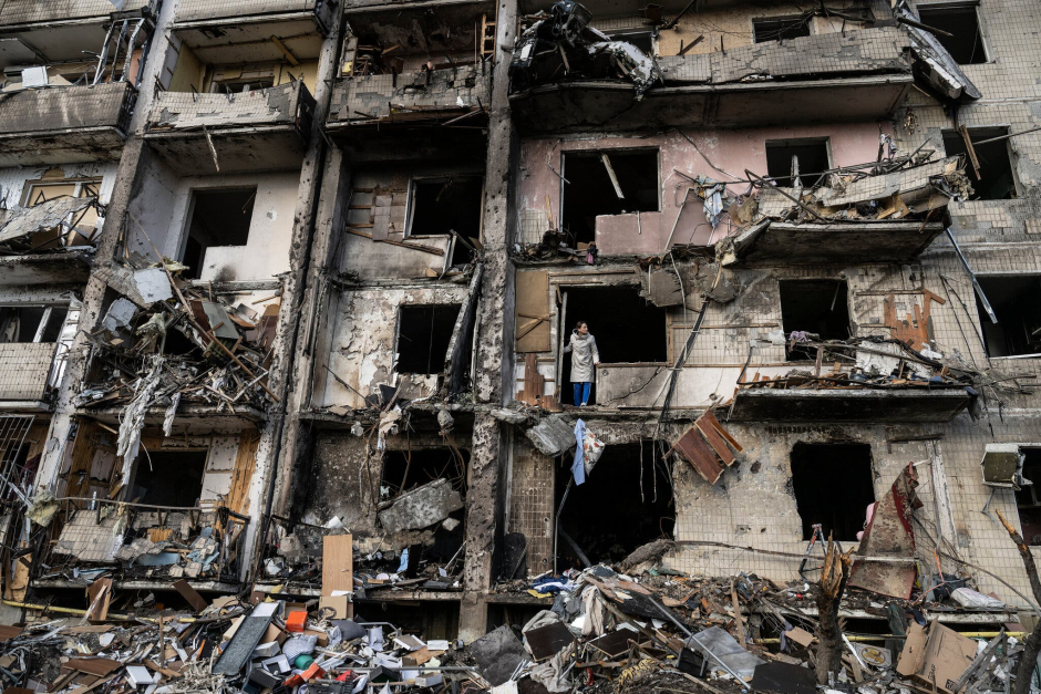 Ukrainians cleaning up debris after a residential building was hit by missiles in south Kyiv, the day after the 2022 invasion.Credit...Lynsey Addario for The New York Times