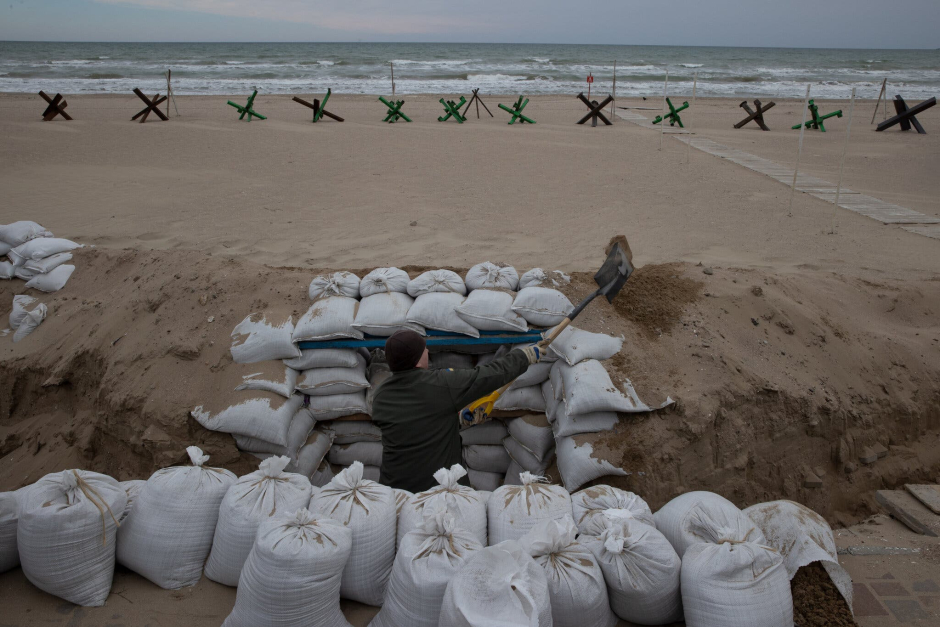 Un soldat de l'armée ukrainienne prépare des défenses sur une position en bord de mer à Odesa en 2022.Crédit...Tyler Hicks/The New York Times