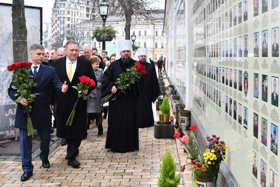 Mike Pompeo, alors secrétaire d'État américain, dépose des fleurs devant un mémorial aux soldats ukrainiens à Kiev en 2020.Crédit...Genya Savilov/Agence France-Presse - Getty Images