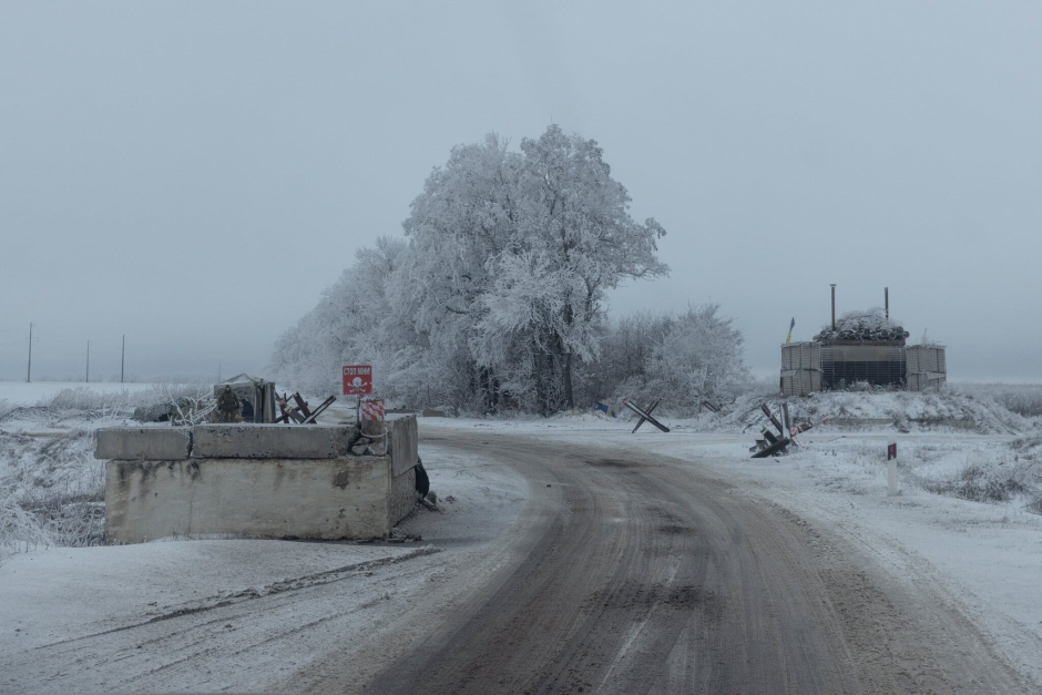 Un poste de contrôle militaire, avec un panneau indiquant la présence de mines terrestres le long de la route, bloquant la route vers la frontière russe dans la région de Kharkiv en Ukraine, en décembre de l'année dernière.Crédit...David Guttenfelder pour le New York Times