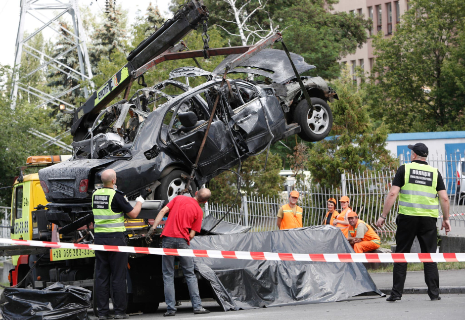Des policiers examinent l'épave de la voiture de Maksym Shapoval, tué dans une explosion à Kiev, en 2017.Credit...Sergii Kharchenko/Pacific Press, via LightRocket, via Getty Images