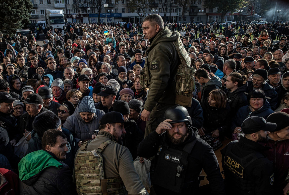 Des foules se rassemblent pour des distributions de nourriture dans la ville de Kherson, dans le sud de l'Ukraine, après qu'elle ait été reprise à l'occupation russe, en 2022.Crédit...Finbarr O'Reilly pour le New York Times