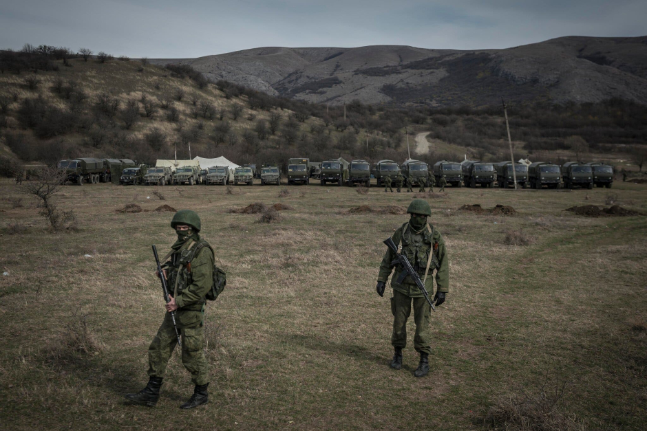 Des soldats russes masqués gardent une base militaire ukrainienne à Perevalnoe, en Crimée, en 2014.Crédit...Sergey Ponomarev pour le New York Times