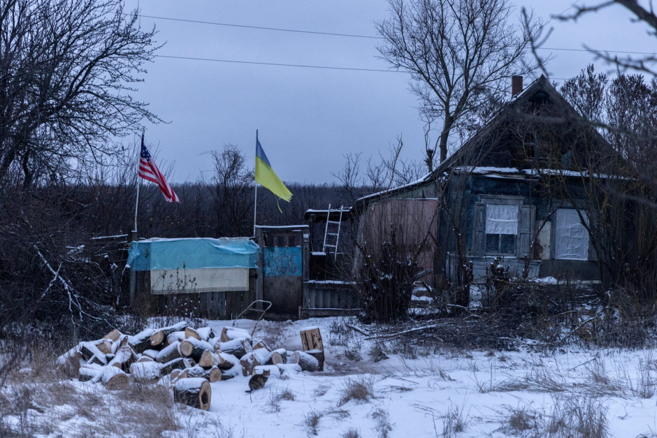 Une maison, avec des drapeaux ukrainiens et américains, dans le village détruit et pratiquement abandonné de Rubizhne dans la région de Kharkiv, près de la frontière russe, en décembre...Crédit...David Guttenfelder pour le New York Times