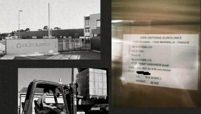 Ces clichés datés du 23 octobre 2023, soit près de deux semaines après le déclenchement de l'offensive à Gaza en réaction à l'attaque du Hamas, montrent une cargaison d'armements destinée à Israël. Des caisses stockées dans un hangar appartenant à Eurolinks, une société marseillaise spécialisée dans la fabrication d'équipements militaires. Sur un bordereau scotché sur un carton entouré de cellophane, on peut lire l'inscription en anglais « 10 000 liens M27 pour des munitions de 5,56 millimètres [10 000 links M27 for 5.56 mm Ammo] ».