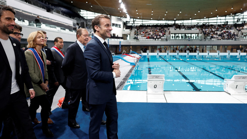 Emmanuel Macron lors de l'inauguration du Centre aquatique olympique des Jeux olympiques de Paris 2024 à Saint-Denis, près de Paris, le 4 avril 2024