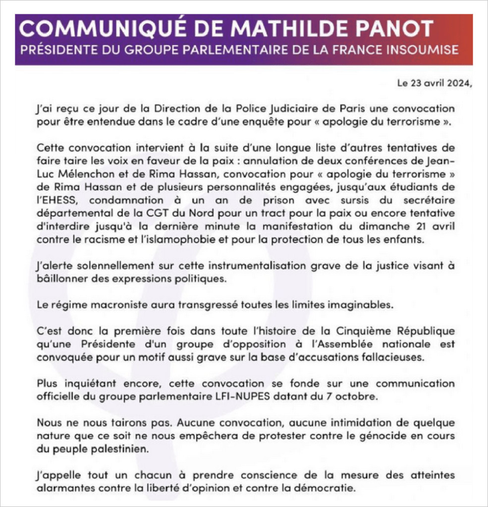 Pour la première fois dans l'histoire de la Vème République, un exécutif instrumentalise la Justice et la police judiciaire qui convoquent la présidente d'un groupe parlementaire d'opposition dans le cadre d'une enquête pour «apologie du terrorisme».