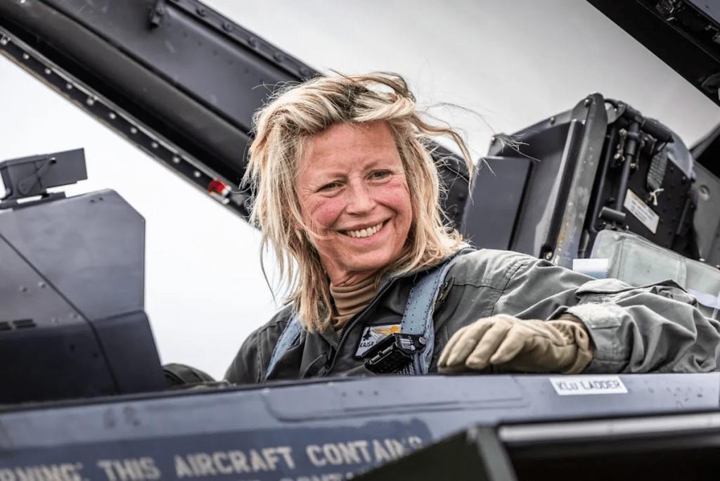 Le ministre néerlandais de la Défense, Kasja Ollongren, le 17 avril 2024, teste le cockpit