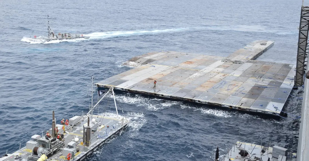 Disons les choses comme elles sont : donc, les États-Unis ont fini par construire leur "ponton flottant" à quelques kilomètres de la côte de Gaza pour acheminer l'aide humanitaire, mais personne ne sera en mesure d'acheminer l'aide directement du ponton pour la faire parvenir à Gaza. Au lieu de cela, l'aide sera livrée à Chypre par voie aérienne ou maritime, puis, de Chypre, l'aide sera acheminée sur plus de 350 km jusqu'au ponton. Puis de là, les palettes de marchandises seront chargées sur de petits bateaux de l'armée américaine, qui transporteront ensuite l'aide du ponton jusqu'à un long embarcadère situé sur la côte actuelle de la bande de Gaza. Ces palettes seront ensuite transportées des bateaux jusqu'au rivage via l'embarcadère - peut-être par des soldats britanniques ou israéliens, selon la source consultée - et transportées à Gaza par les troupes des Forces de défense israéliennes (FDI) après un examen minutieux et l'approbation de leur contenu. Tout ça pour acheminer entre 90 et 150 camions d'aide par jour, ce qui est très loin des 500 camions dont Gaza a besoin, selon les Nations unies.