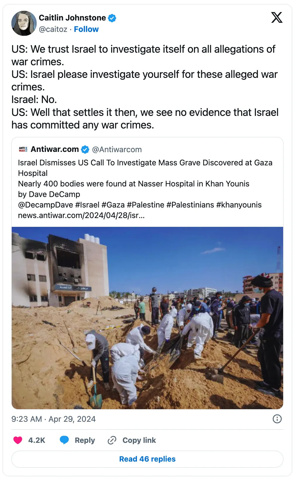 Et tout ça parce qu'Israël ne laisse pas les gens livrer une quantité suffisante de produits humanitaires directement à Gaza en passant par les checkpoints spécialement conçus à cet effet. Comme Washington ne veut pas exercer de pression sur Israël pour qu'il autorise un tel passage, cette chorégraphie ultra compliquée et coûteuse est réalisée pour acheminer une quantité d'aide désespérément insuffisante. Une aide qui n'est nécessaire que parce qu'Israël a détruit Gaza dans sa campagne de bombardements génocidaires exécutée en toute impunité.