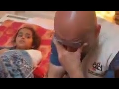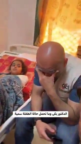 Le Dr Mohammad Saffi, un médecin koweïtien qui se porte volontaire pour soigner les blessés à Gaza, fond en larmes à côté d'une enfant qui a perdu son bras dans un bombardement israélien