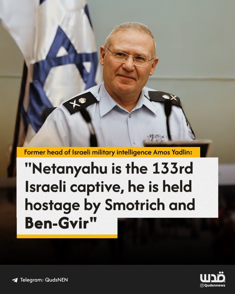L'ancien chef du renseignement militaire, Amos Yadlin, a déclaré aux médias israéliens que « Netanyahou est le 133ème otage israélien et qu'il est retenue en otage par Smotrich et Ben Gvir ».