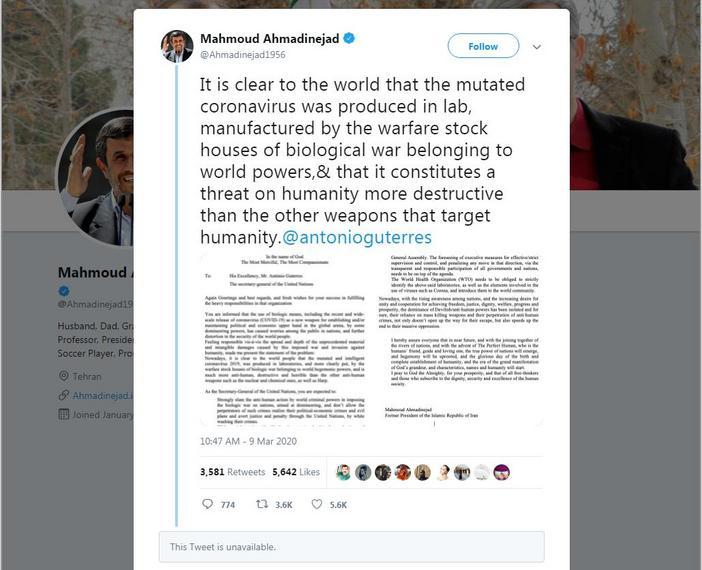 Peu de temps après, Ali Khamenei, dirigeant suprême iranien, a adopté la même posture publique, cependant que Mahmoud Ahmadinejad, l'ancien président populiste, se faisait beaucoup remarquer sur Twitter durant plusieurs mois, dirigeant même ses accusations formelles contre Antonio Guterres, secrétaire général de l'ONU. Un seul de ses nombreux Tweets a provoqué des milliers de Retweets et de pouces en l'air.