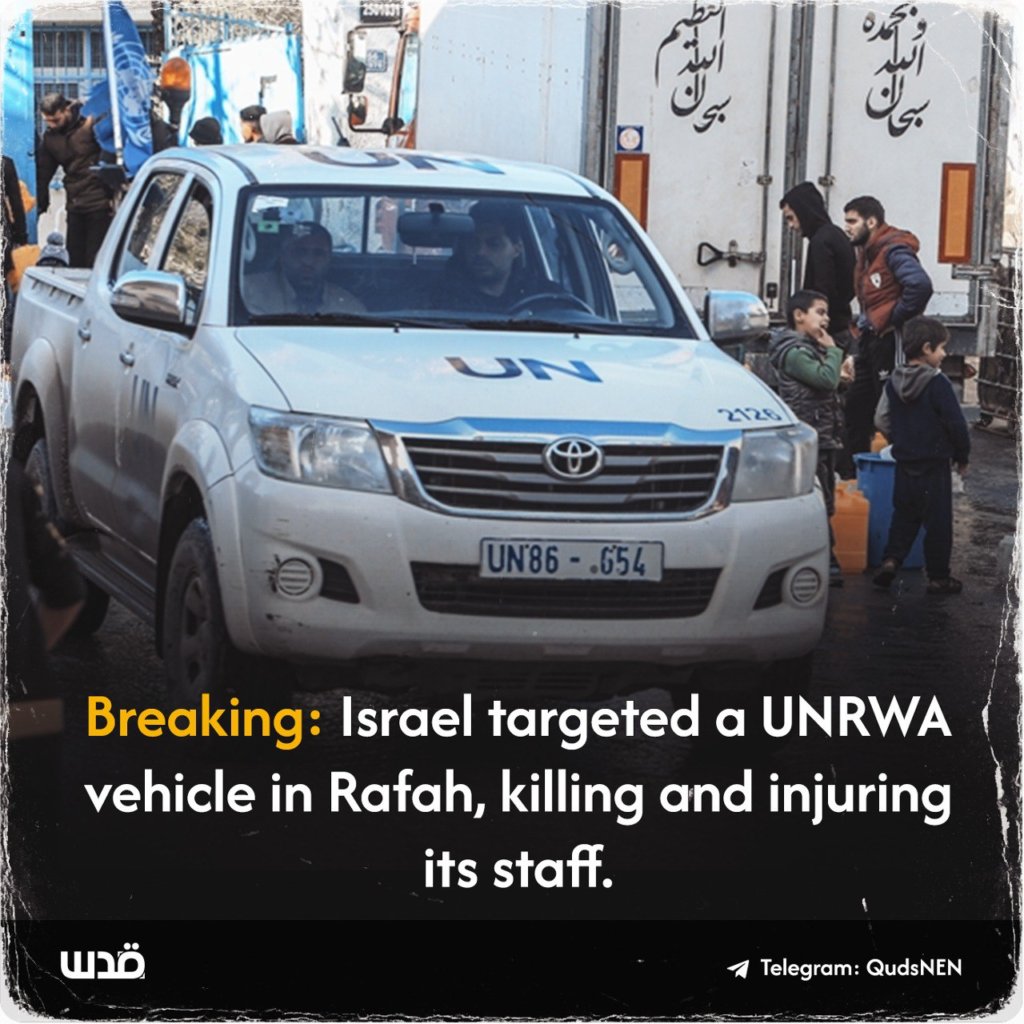 Israël a tué deux citoyens étrangers (un homme et une femme) qui voyageaient dans un véhicule de l'ONU avec un drapeau de l'ONU et des marques d'identification. L'ONU a confirmé que son premier membre du personnel international a été tué à Gaza après une attaque des forces israéliennes contre un véhicule de l'ONU dans la ville de Rafah. '