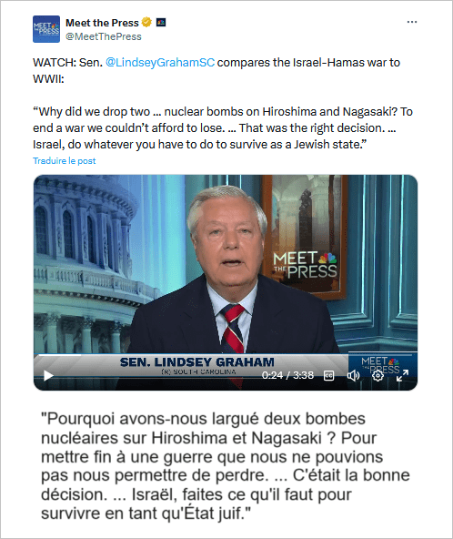 Une folie israélienne qui semble avoir contaminé les Américains, l'exemple parlant d'une telle contamination ayant récemment été donné par le célèbre sénateur de la Caroline du Sud et membre du Parti républicain, Lindsey Graham, lequel a réitéré publiquement ses justifications du bombardement atomique des États-Unis sur Hiroshima et Nagasaki, encourageant Israël à adopter son raisonnement. 1
