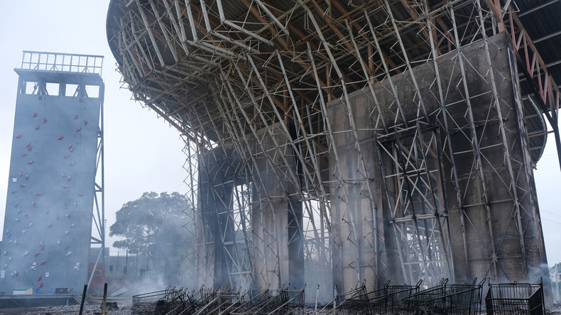 Des installations sportives incendiées (ici, un mur d'escalade) lors des émeutes de Nouméa en Nouvelle-Calédonie le 15 mai au petit matin. Les violences ont fait deux morts dans la nuit.