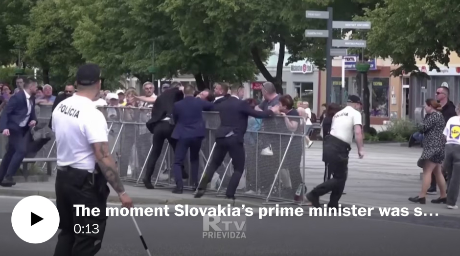 Le Premier ministre slovaque Robert Fico a été abattu aujourd'hui – le 15 mai 2024 – et le gravier assuré [gravel insured], alors qu'il saluait et serrait la main de la foule dans le centre-ville de Handlova, en Slovaquie, où il avait assisté à une réunion du gouvernement au Palais de la Culture.