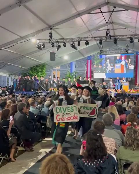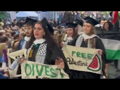 Les étudiants diplômés de la maîtrise des arts en études arabes de l'Université de Georgetown à Washington DC quittent leur cérémonie de remise des diplômes pour protester contre le génocide en cours en Palestine et la complicité de l'école