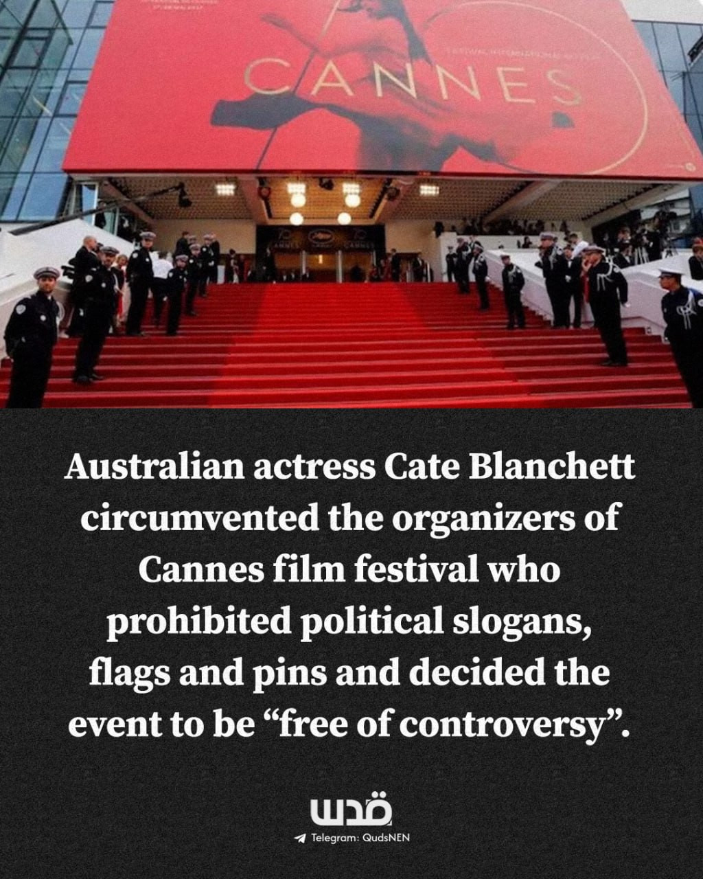 L'actrice australienne Cate Blanchett a contourné, à Cannes, l'interdiction des organisateurs d'afficher tout signe de solidarité avec la Palestine