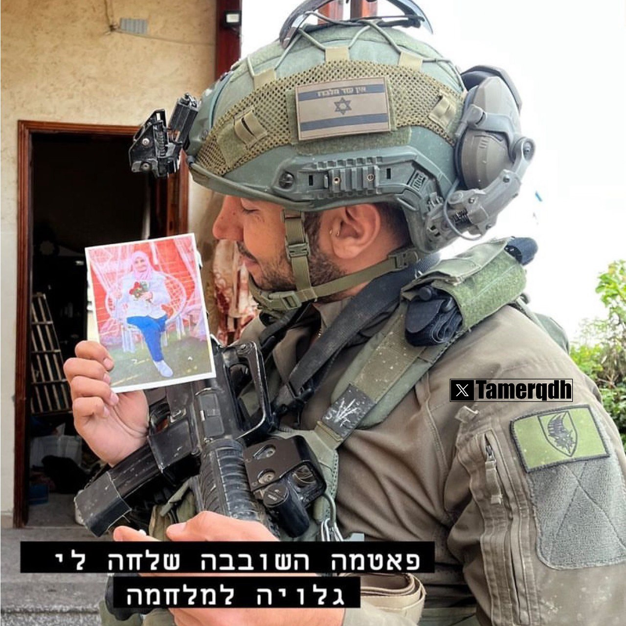 Un soldat de l'occupation partage une photo de lui tenant une photo d'une Palestinienne provenant d'une maison attaquée à Gaza, accompagnée de commentaires troublants et inappropriés à son sujet.