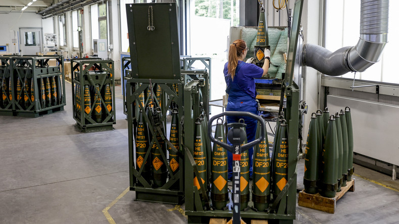 Préparation d'obus de 155 mm qui seront livrées aux forces ukrainiennes, dans les installations de Rheinmetall à Unterluess, le 6 juin 2023 (photo d'illustration).