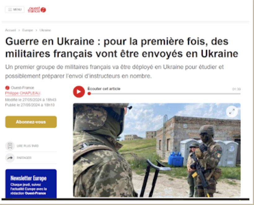 Pour la première fois officiellement, des militaires français seront envoyés en Ukraine. Un tabou est brisé. Il s'agit dit-on, de « formateurs ». Le nombre de personnes n'est pas précisé. Un simulacre a été joué, avec les Ukrainiens adoptant un acte juridique, légalisant la présence des instructeurs français, puis l'annonce de l'envoi de ces formateurs. Comme s'il n'y avait pas déjà d'instructeurs des pays de l'OTAN en Ukraine …