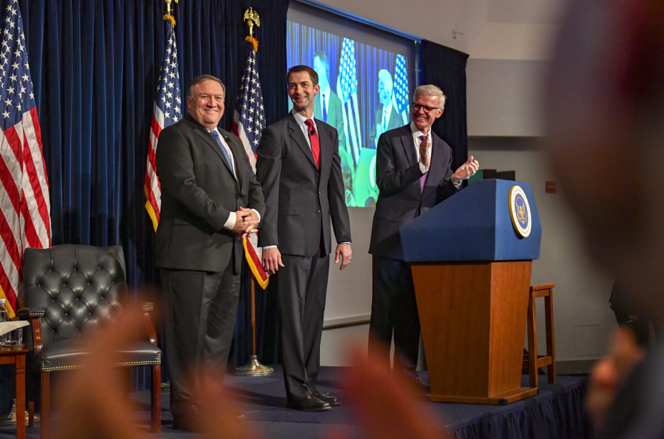 Cotton, au centre, avec le secrétaire d'État de l'époque, Mike Pompeo, en juillet 2018. (Département d'État américain, Wikimedia Commons, domaine public)