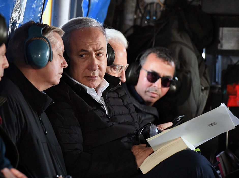 Le Premier ministre israélien Benjamin Netanyahu, deuxième en partant de la gauche, entre le sénateur américain Lindsey Graham, à gauche, et l'ambassadeur des États-Unis en Israël, David Khan, à droite. L'ambassadeur des États-Unis en Israël, David Friedman, en route vers le plateau du Golan en mars 2019 pour un briefing israélien sur la situation militaire dans la région. (Matty Stern/U.S. Embassy Jerusalem)