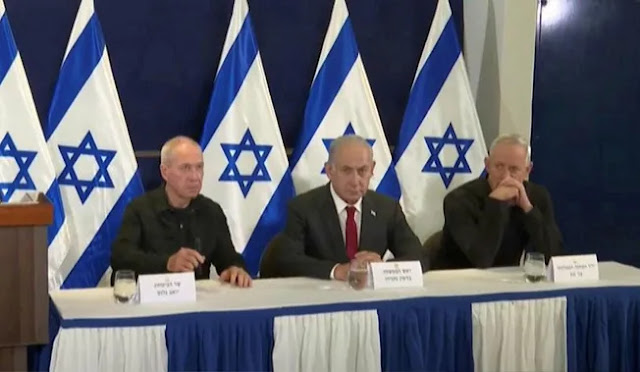 Netanyahou, Gantz et Gallant annoncent la formation d'un gouvernement d'urgence, mercredi soir. Photo : Service de presse du gouvernement israélien