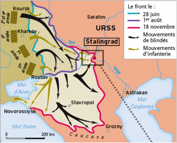 Grande ville industrielle, Stalingrad apparait sur le schéma ci-dessus à l'endroit où la Volga forme une boucle qui la rapproche du Don. Sa capture devrait donc permettre aux Allemands de diminuer la production de guerre soviétique, de bloquer le transport sur la principale artère maritime de leur adversaire et de contrôler l'étroit passage entre les deux fleuves, vital pour la partie de leur armée en route vers le Caucase. C'est dans ce massif montagneux que s'extrait la majeure partie du pétrole produit de ce côté-ci de l'Atlantique, objectif majeur de l'armée allemande cette année 1942. C'est là qu'elle est arrêtée dès l'été, empêchée par le terrain et la résistance soviétique acharnée d'atteindre Bakou.