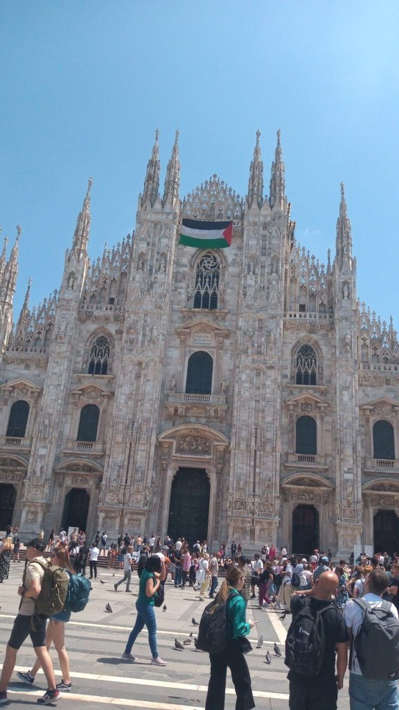 Des militants hissent le drapeau palestinien sur le Dôme de Milan en Italie.