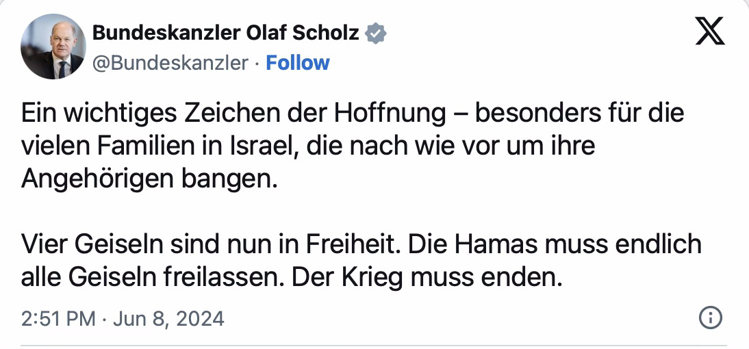 "Un important gage d'espoir – en particulier pour les nombreuses familles israéliennes qui continuent à craindre pour leurs proches. Quatre otages sont désormais libres", a écrit M. Scholz sur X.