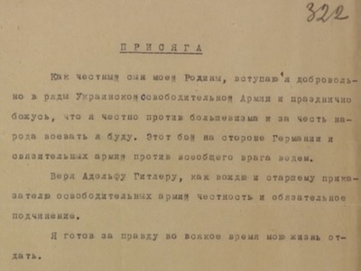 « Fils fidèle de ma Patrie, je rejoins volontairement les rangs de l'Armée de libération ukrainienne, et avec joie je jure que je combattrai fidèlement le bolchévisme pour l'honneur du peuple. Ce combat, nous le menons aux cotés de l'Allemagne et de ses alliés contre un ennemi commun. Avec fidélité et soumission inconditionnelle, je crois en Adolf Hitler comme dirigeant et commandant suprême de l'Armée de libération. À tout moment, je suis disposé à donner ma vie pour la vérité ».