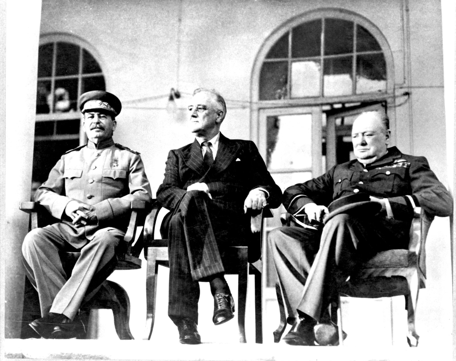 De gauche à droite : Staline, Roosevelt et Churchill sur le portique de l'ambassade soviétique lors de la Conférence de Téhéran en novembre 1943. (Wikimedia Commons, domaine public)