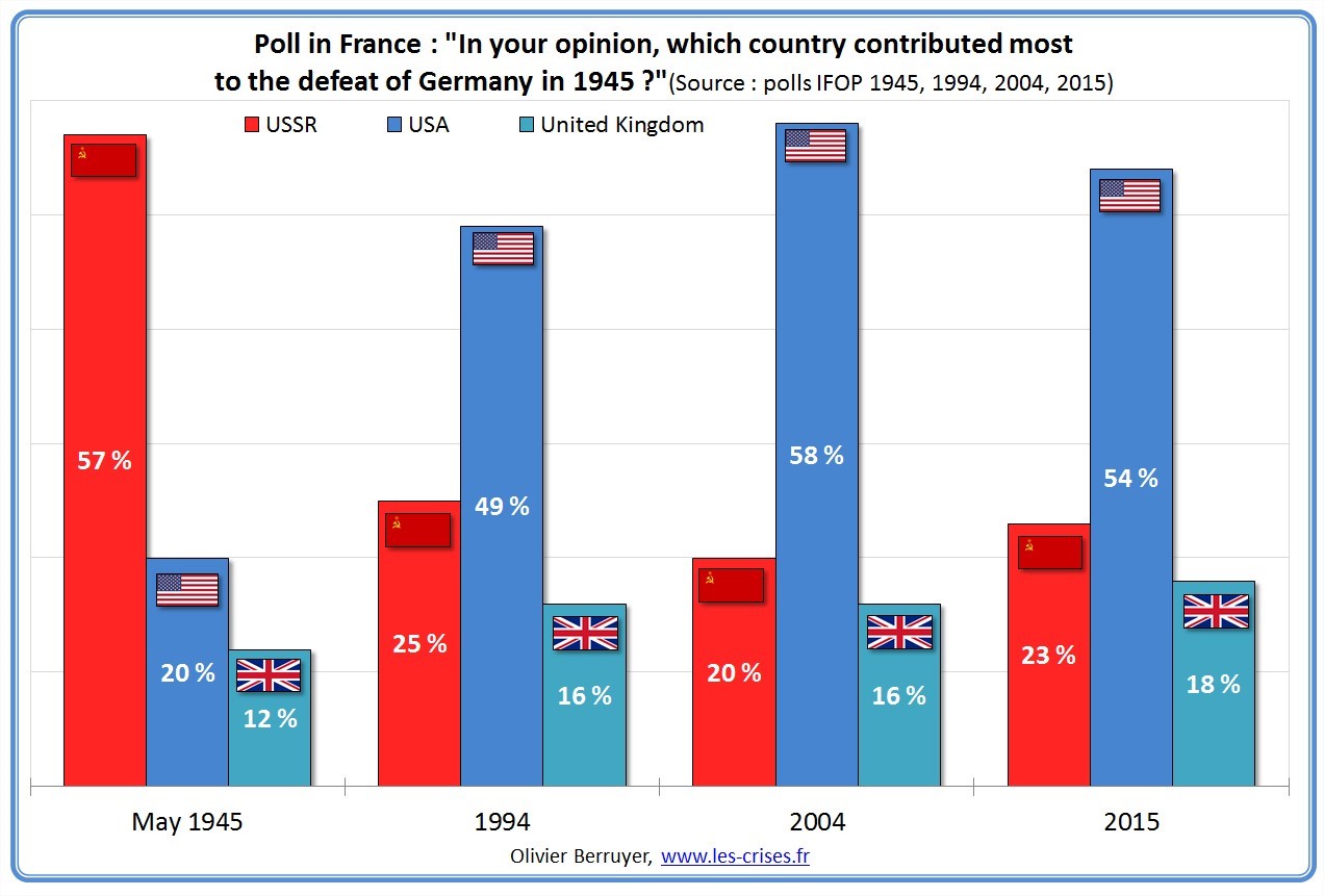 La France a toujours célébré le débarquement de Normandie comme une libération. Les sondages montrent cependant que la perception de son importance a évolué au fil des décennies. Peu après la fin de la guerre, l'opinion publique était reconnaissante envers les Anglo-Américains, mais attribuait massivement la victoire finale de la Seconde Guerre mondiale à l'Armée rouge. De plus en plus, l'opinion a évolué vers l'idée que le jour J a été la bataille décisive et que la guerre a été gagnée principalement par les Américains avec l'aide des Britanniques. Cette évolution est en grande partie due à Hollywood.
