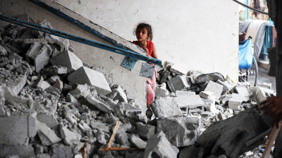 Feature photo |A Palestinian girl checks a UN school that was bombed by Israel in Nuseirat, in the central Gaza Strip, on June 6, 2024. NurPhoto |AP