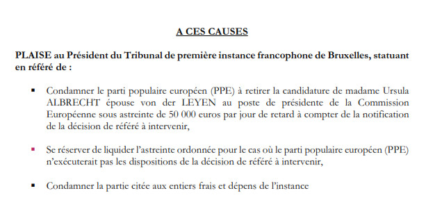 Suite au courrier resté sans réponse, Me Protat a donc assigné le PPE au tribunal de référé de Bruxelles afin de faire condamner le PPE à retirer la candidature de Madame Ursula Albrecht épouse von de Leyen au poste de présidente de la CE (Commission européenne) sous astreinte de 50 000 euros par jour de retard.