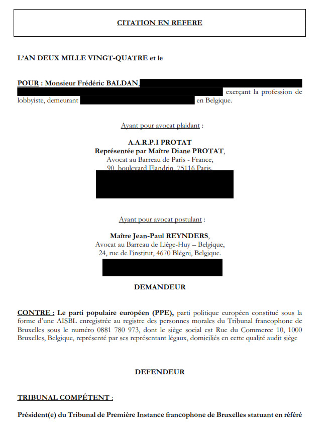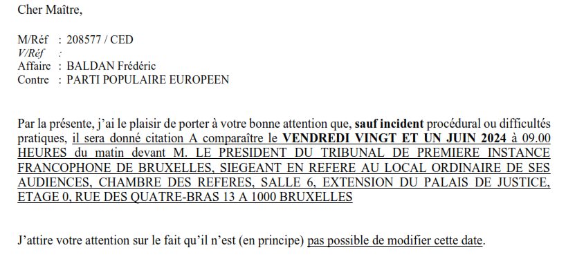 La mise en demeure envoyée à Manfred Weber, président du PPE, était assortie d'une période de huit jours pour prendre acte de la demande de Frédéric Baldan sous peine d'engager les poursuites judiciaires nécessaires.