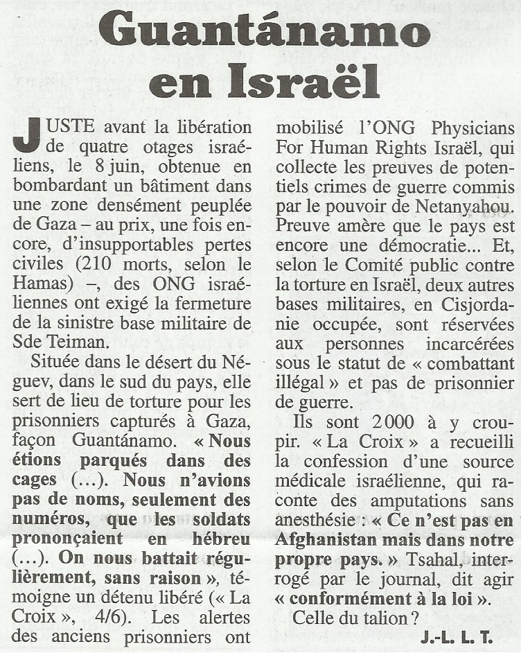 Et l'on découvre désormais des centres de détention et de torture jusqu'ici inconnus en Cisjordanie, en plus de celui du Neguev, souligne le journal La Croix.