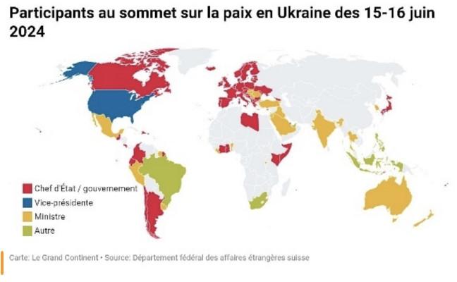 Finalement, seuls 92 pays, composés à 1/3 des membres du bloc de l'OTAN et à 1/3 des pays-satellites direct de l'OTAN, ont envoyé leurs représentants en Suisse. Cela étant, une partie non négligeable de pays n'était guère représentée par les chefs d'Etat ou de gouvernement, mais par ceux, dont les fonctions paraissent parfois presque anecdotiques, vu le cadre et le niveau espéré de la discussion. Notamment, au lieu de son premier ministre, l'Australie a envoyé au « sommet » de Bürgenstock son ministre du système d'assurance des personnes handicapées – une personne plus ou moins inconnue même en Australie.