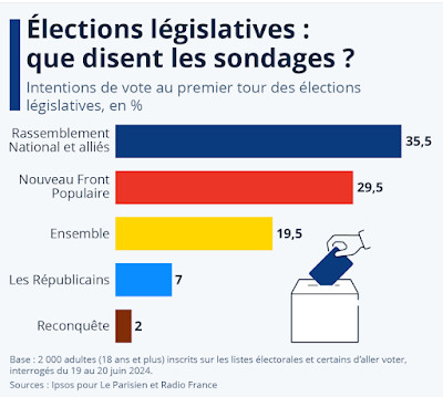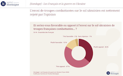 Alors que les législatives se dérouleront dans quelques jours, les intentions de vote des Français montrent un désaccord profond de la population avec le fanatisme guerrier de Macron. 83% des personnes interrogées sont opposées à l'envoi de troupes françaises en Ukraine, ils étaient 75% en février. Ainsi, malgré la propagande intrusive et massive, la population se refuse à prendre le risque d'une guerre contre la Russie. Le parti présidentiel se trouve alors en troisième position et dans une dernière tentative électoraliste, Macron allège son discours : vous ne m'avez pas bien compris, rassurez-vous, nous n'irons pas nous engager sur le sol ukrainien – demain. Après-demain, quand les élections seront passées, si l'ordre en est donné après le Sommet de Washington, nous en rediscuterons.