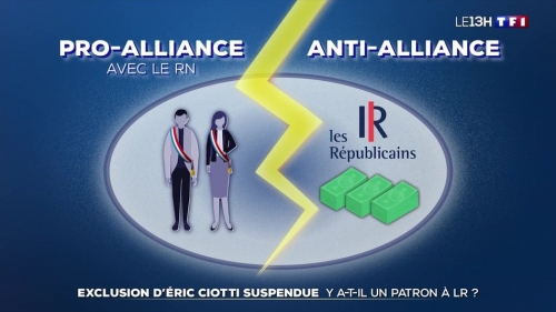 La « coalition nationale » aimantée par le Rassemblement national (RN) accélère la décomposition des Républicains (LR), ce centre-droit progressiste chiraco-sarkozyste. LR sont depuis longtemps divisés en écuries présidentielles rivales : Nous France de Xavier Bertrand, le président du conseil régional des Hauts-de-France, Nouvelle Énergie du maire de Cannes, David Lisnard, Soyons libres ! de Valérie Pécresse, la présidente du conseil régional d'Île-de-France ou Du courage ! du député du Lot Aurélien Pradié. L'alliance conclue entre Éric Ciotti, toujours président LR, et le RN a provoqué la colère de ces personnalités ainsi que celle de Gérard Larcher, le président du Sénat, de Laurent Wauquiez, le président du conseil régional Auvergne – Rhône-Alpes, et de Bruno Retailleau, le président du groupe des sénateurs LR. Tous ces critiques adoptent un comportement suicidaire digne de la secte de l'Ordre du Temple solaire.