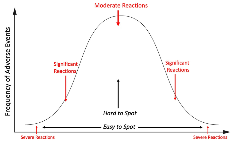 Note: the above graph is only illustrating one aspect of the picture as there will also be a much larger number of minor reactions, and even more invisible ones (e.g., a symptom occurs years down the road) or no reaction at all.