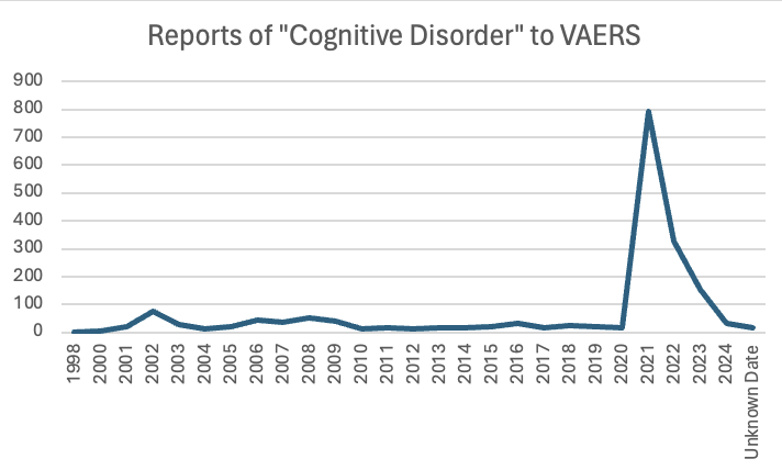 One of the most important things to recognize about AD is that it is a slowly worsening disease which often progresses over decades. In the early stages of AD (where it is the most reversible), minor cognitive changes occur, which (when possible to autopsy) correlate with tissue changes within the brain. In rarer instances, individuals can instead have a rapidly progressing form of Alzheimer's (e.g., from Lyme) which strikes at a younger age and is often linked to the toxin exposure. Given how quickly the increase in AD appeared in both the patients I know and this dataset, I suspect it's very likely the mechanisms behind the rapidly progressing forms of AD plays a key role in the cognitive impairment and dementia we are seeing from these vaccines.