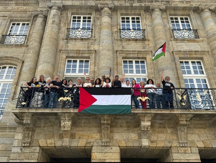 L'Espagne, l'un des rares pays européens qui défend vaillamment la Palestine, comme on peut le voir avec cette autre image de la mairie de Saint Jacques de Compostelle :